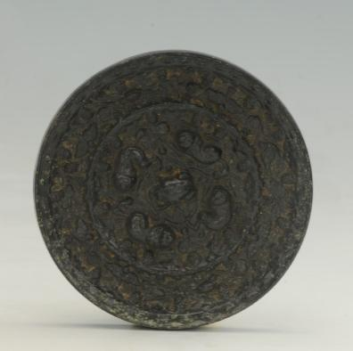 这是唐代海兽葡萄镜,其直径12.3厘米,厚1.3厘米。兽钮。内区纹饰作高浮雕瑞兽图,兽为八狻猊,或奔跑,或安卧,情态各异,外有葡萄,空隙处以蔓枝填充。海兽葡萄镜,又称“狻猊葡萄镜”,是唐镜中最具特色的镜种之一,最早出现在唐高宗时期,盛行于武则天、唐中宗时期。有人认为此类镜中的海兽应为狻猊,狻猊就是古代的狮子。唐代葡萄不断输入长安,葡萄纹在工艺美术领域普遍使用。此类纹饰的铜镜,正是长安接纳西域文化之风的实物例证。