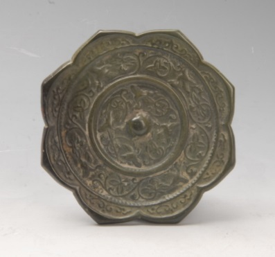直径9.5厘米,厚0.4厘米,余杭双桥出土镜菱花形,镜面纹饰有界隔,分内外两区,内区为四鸟绕钮一周,间饰以花枝。外区亦为四鸟绕钮而飞,间饰以缠枝花卉,外区纹饰与外缘间饰以勾云纹。