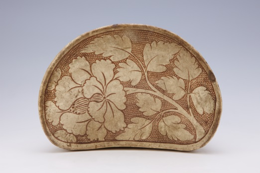 高11.5厘米,口径26.2厘米,底径18.2厘米,腰圆形,枕面呈缓坡状,向中间倾斜。背部侧面上方有一小孔。胎体坚硬,呈黄色。施乳白色釉,釉层均匀,釉面光滑。枕面有赭褐色彩绘,彩绘以细密的赭色珍珠戳印纹作底,上绘一朵折枝牡丹花,花朵舒展,华贵典雅。枕体造型规整,纹饰优美。装饰手法独特,是河南登封窑的常见器。