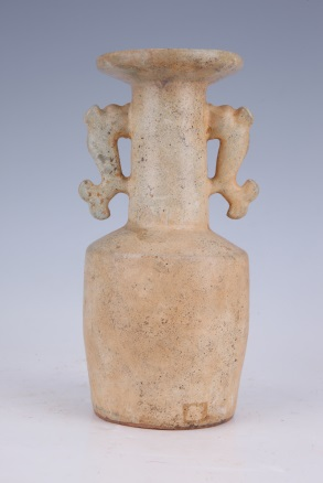 高17.6厘米,口径7.2厘米,底径7.1厘米,1978年杭州古荡出土棒槌形。平口上翘、高颈、斜折肩、筒腹、下部微敛、圈足内挖。底部施釉,圈足刮釉规整。露胎呈橘红色。胎质显疏松,施青釉,通体生烧,呈米黄色。口沿至耳部有局部的粉青色。颈部塑对称双鱼耳,造型古朴典雅。