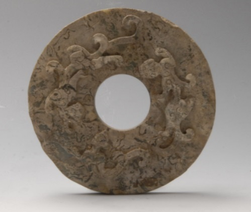壁径13.78厘米,孔径4.2厘米,厚1.35厘米,杭州灵隐出土青玉质,正面浮雕3只爬行的螭龙。背面内区饰涡纹,外区饰细网格纹,中饰4个花结。