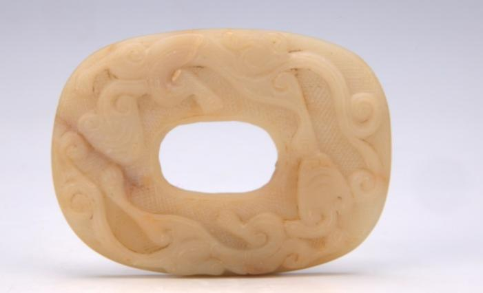 长6.6厘米,宽4.9厘米,1998年浙江大学出土椭圆形,正面浮雕双螭,两螭首尾相接,用身体组成环状,身形柔美,曲线圆滑,底以阴刻斜格纹作装饰,不规则。素面光滑。