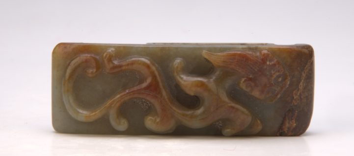 长7.1厘米,宽2.5厘米,高1.9厘米,扁长方形,浮雕一S形蟠螭,尾呈卷草纹。从侧面看两端内卷,背面有长方形穿孔。整器雕琢风格圆润。