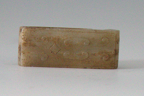 长6厘米,宽2.3厘米,高1.3厘米,长方形,一端下卷,局部受沁,正面阳刻两处上下对称的勾云纹,其间阴刻一处菱形纹饰。背面有长方形穿孔。整器造型古朴。