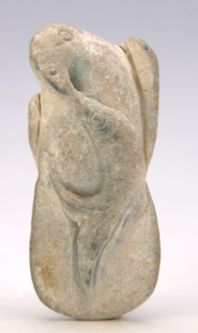 长6厘米,宽2.5厘米,琉璃质,受沁呈灰白色,表面仍可见湖蓝色原色。采用圆雕法雕出一只刚刚获利的鱼鹰,口衔一尾肥硕的鲤鱼。鹰羽翼丰满,阴线刻划装饰。整器利用谐音寓意盈利,造型古朴浑厚。