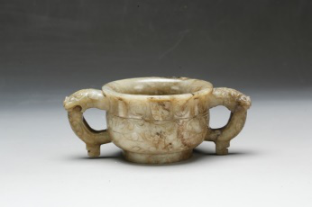 玉料整体呈不透明的乳白色,有深褐色沁。口沿外卷,束颈,深圆腹,圈足,器身两侧有环耳。颈部中间浮雕兽首,尖眼,两立耳,似为螭龙。腹部浮雕兽面纹,尖眼、卷眉、倒T字形鼻,兽面纹外阴刻回纹,两耳为浮雕螭龙的造型,圆眼、卷眉、尖耳、卷鼻。全身饰卷云纹。