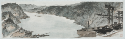 此件山水属傅抱石1963年在浙江休养期间创作的作品之一。所绘之景开阔雄壮,一江碧水东向逶迤而去,两岸青山秀丽绵延,观者恍若置身新安江水坝之上,亲历美景。
