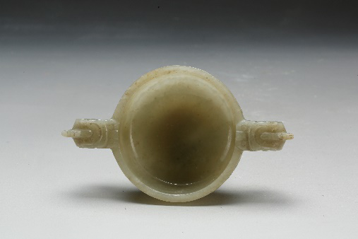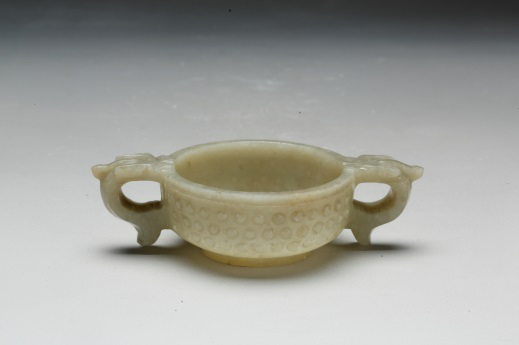 簋(guǐ)形玉杯。玉料呈青黄色,略有褐色沁。器身呈圆形,折口,平沿,鼓腹,圈足,内壁光素,外壁浮 雕三层乳丁纹,乳丁纹上下两层间隔排布。两耳为对称的龙形垂珥,龙圆眼,嘴衔口沿,头顶饰双角,颈后有鬃毛,尾下垂成珥。簋,盛食器,商周时期,青铜簋成为代表贵族身份的礼器。后世也制作仿古簋形器,此件是用玉料仿制青铜簋,器形较小,已无盛食作用,或作为玉杯使用。