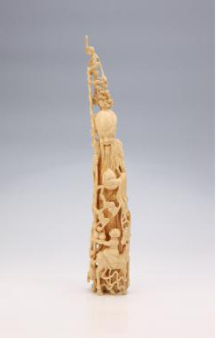 象牙质地,色嫩黄。依象牙形状雕成。寿星右手持仗,左手托桃,寿眉如弯月,长须飘飘,衣着富贵,上有“富、禄”字样。寿星周边镂雕仙童骑鹿献桃图及蝙蝠、葫芦等图案,展现了富、禄、寿的吉祥主题。