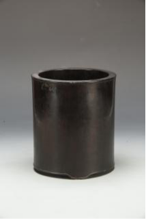 紫檀木,圆筒形,三矮足,筒身素面,口、底部边沿起棱,造型简练端庄。笔筒是中国古代除笔、墨、纸、砚以外最重要的文房用具,为筒状盛笔的器皿,多为直口,直壁,口底相若,造型相对简单,没有大的变化。材质却颇为丰富,有竹、瓷、木、铜、象牙、玉、水晶、端石、漆等。从装饰方法上看,有刻、镂、雕、绘等。